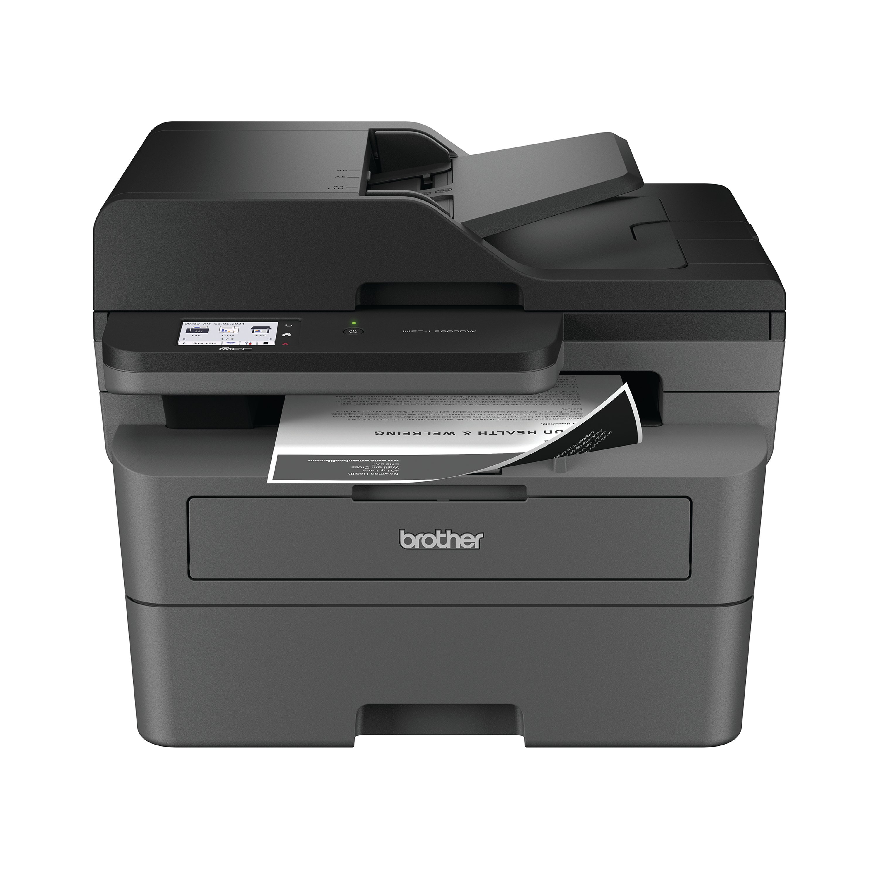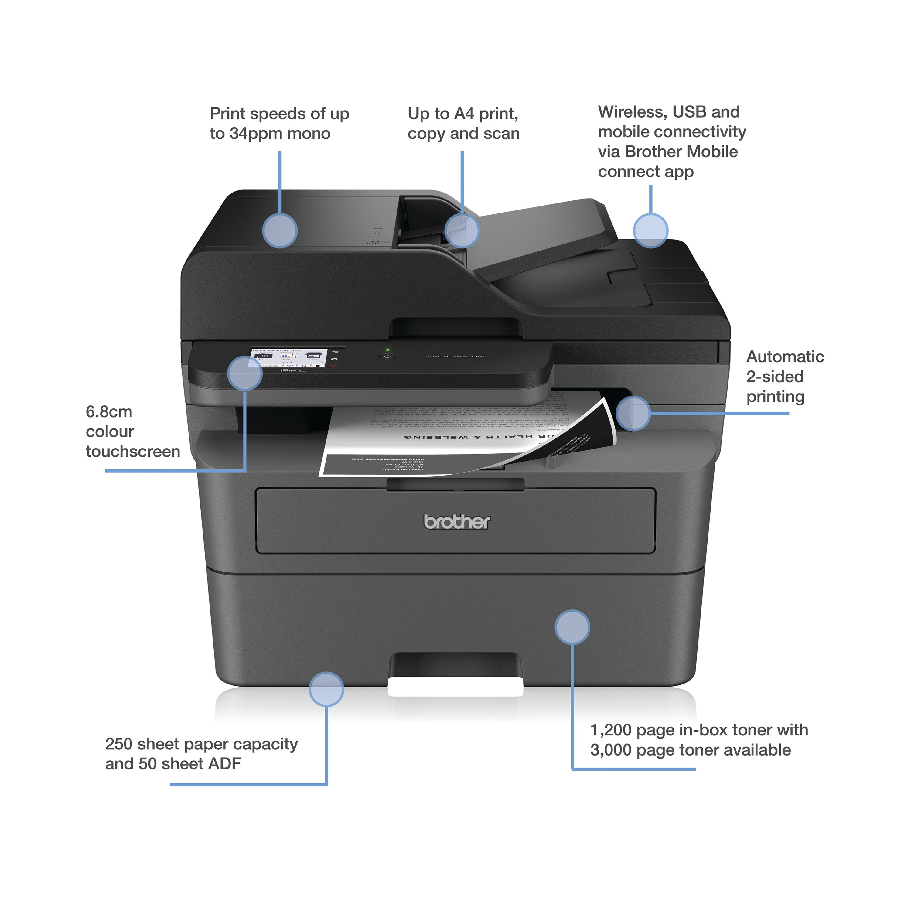 Work smarter from anywhere at home or in the office with the easily connected Brother MFC-L2860DW mono A4 all-in-1 laser printer. With a 256MB internal memory. Secure by design, it uses triple-layer security at a device, network and document level, for peace of mind and guarantees that the integrity of your data is maintained. Hosting a range of efficiency-boosting features, this all-in-1 mono laser printer saves you time with fast flawless printing and quick scan speeds, automatic 2-sided print, ADF and a generous 250 sheet paper tray capacity. 1-sided printing and copying of up to 34 copies per minute, with a resolution of up to 1200 x 1200 dpi (printing) 600 x 600 dpi (copying). The contact image sensor (CIS) scanner provides colour and mono scanning, 1200 x 1200 dpi. Fax modem with 33,600bps (Super G3), send the same fax message to up to 250 locations, a memory transmission of up to 500 pages. Connect with Hi-Speed USB 2.0, Wireless, Wi-Fi Direct. Mobile and Web connectivity: Brother Mobile Connect, Brother Print Service Plugin, Mopria (Android), Brother Mobile Connect (iPad/iphone), Apple AirPrint, Web Connect. A quiet mode to reduce the printing noise. All controlled via a 6.8mm LCD touchscreen control panel. Supplied with an in-box toner with a page yield of up to 1,200 pages (black).
