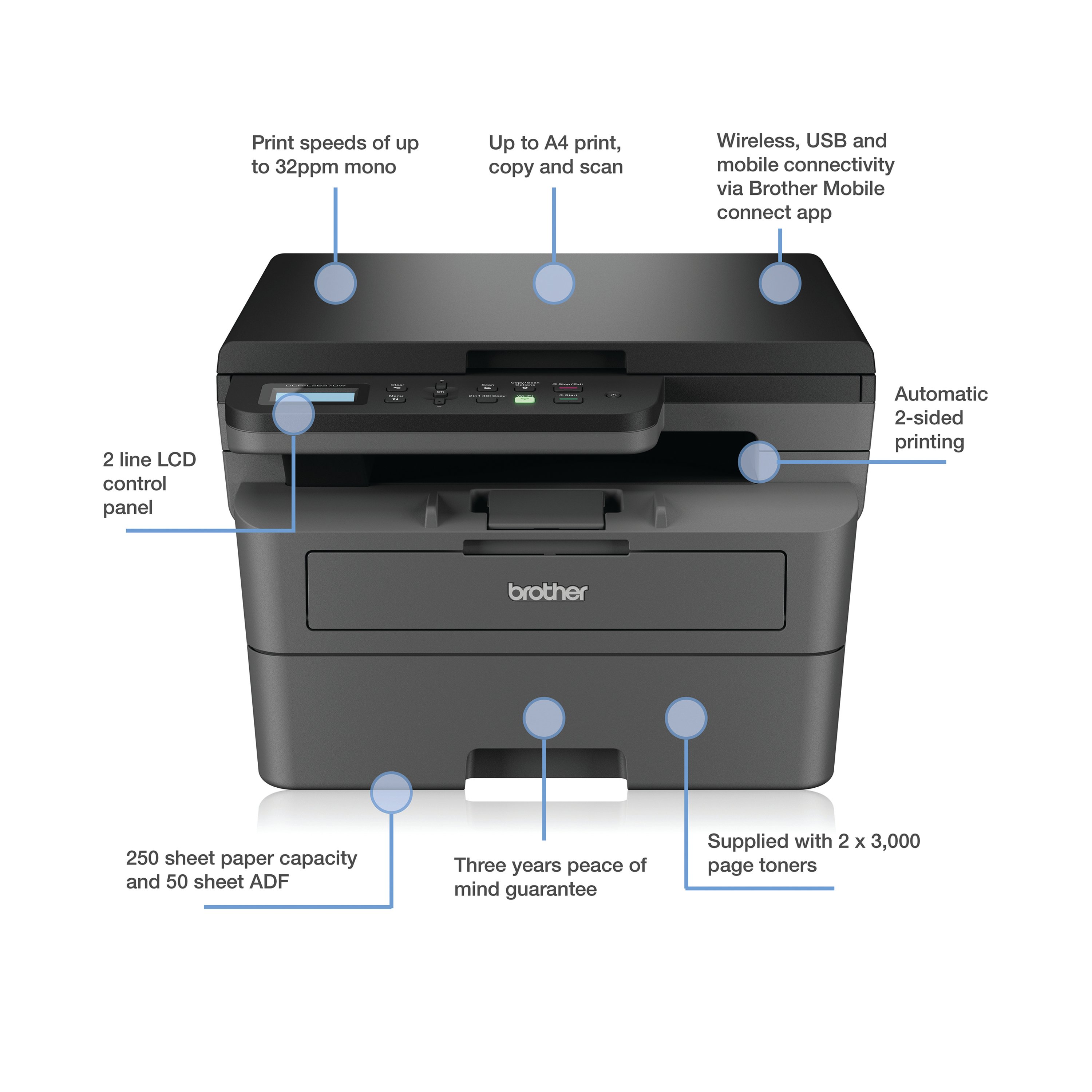 Work smarter from anywhere at home or in the office with the easily connected Brother DCP-L2627DWXL mono A4 3-in-1 laser printer. Supplied the all in box print bundle: 6,000 toner prints (2 x 3,000 page high yield toner cartridges) and a 3-year peace of mind guarantee. With a 128MB internal memory. Secure by design, it uses triple-layer security at a device, network and document level, for peace of mind and guarantees that the integrity of your data is maintained. Hosting a range of efficiency-boosting features, this 3-in-1 mono laser printer saves you time with fast flawless printing, copying and quick scan speeds. 1-sided copying and printing of up to 32 copies per minute, with a resolution of up to 600 x 600 dpi (copying), 1200 x 1200 dpi (printing). Automatic 2-sided printing and a generous 250 sheet paper tray capacity. The contact image sensor (CIS) scanner provides colour and mono scanning, 1200 x 1200dpi resolution. Connect with Hi-Speed USB 2.0, Wireless, Wi-Fi Direct. Mobile and Web connectivity: Brother Mobile Connect, Brother Print Service Plugin, Mopria (Android), Brother Mobile Connect (iPad/iphone), Apple AirPrint. A quiet mode to reduce the printing noise. All controlled via a 2 line LCD with keys control panel.