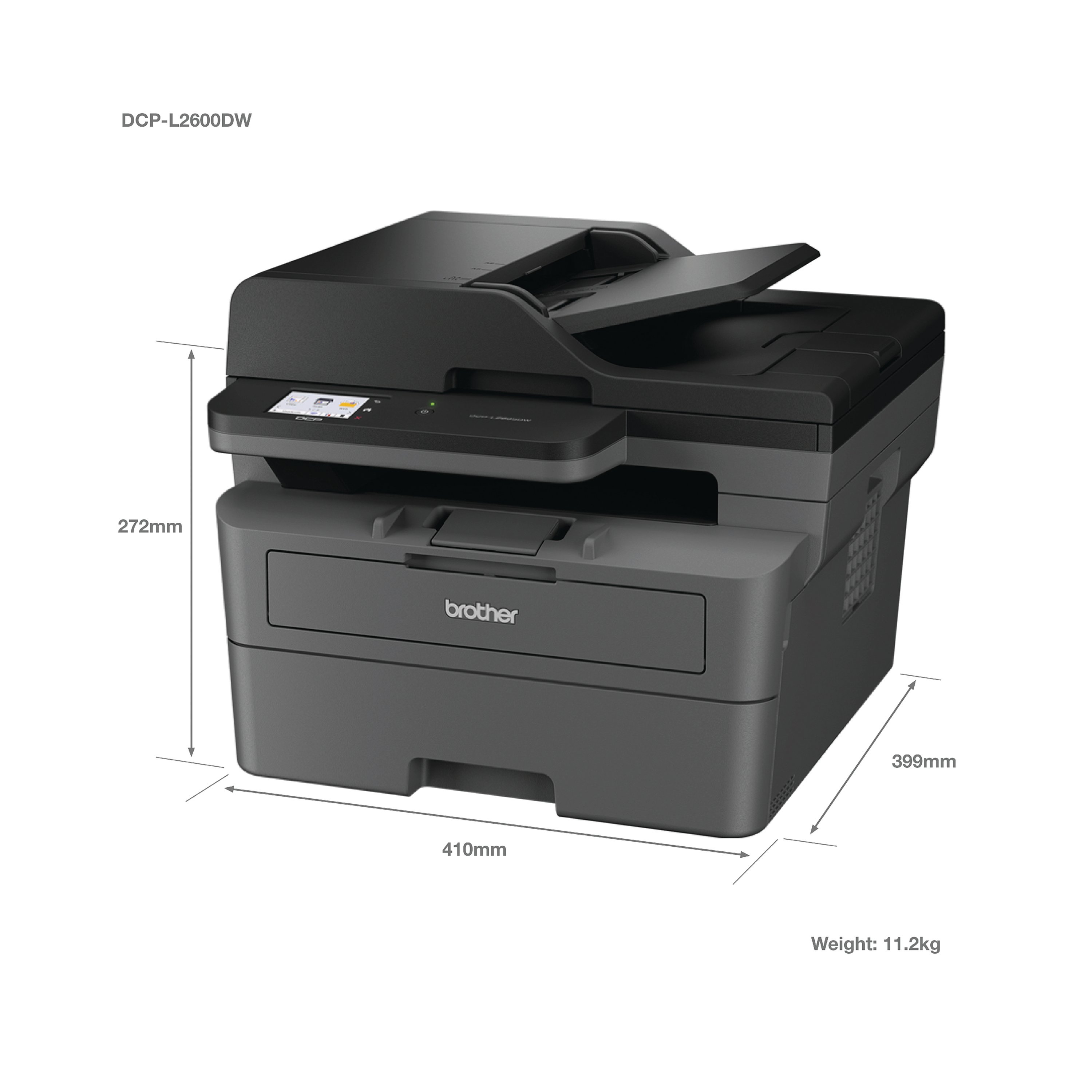 Work smarter from anywhere at home or in the office with the easily connected Brother DCP-L2660DW mono 3-in-1 laser printer. With a 256MB internal memory. Secure by design, it uses triple-layer security at a device, network and document level, for peace of mind and guarantees that the integrity of your data is maintained. Hosting a range of efficiency-boosting features, this 3-in-1 mono laser printer saves you time with fast flawless printing and copying of up to 34 ppm, with a resolution of up to 1200 x 1200 dpi (printing) and 600 x 600 dpi (copying), with automatic 2-sided print. Quick scan speeds of up to 22.5ipm 1-sided, mono and 7.5ipm colour. A generous 250 sheet paper tray capacity and 50 sheet automatic document feeder (ADF). Connect with Hi-Speed USB 2.0, Wireless, Wi-Fi Direct. Mobile and Web connectivity: Brother Mobile Connect, Brother Print Service Plugin, Mopria (Android), Brother Mobile Connect (iPad/iphone), Apple AirPrint, Brother apps, Web Connect. A quiet mode to reduce the printing noise. All controlled via a 6.8cm colour touchscreen panel. Supplied with a 1,200 page yield toner.