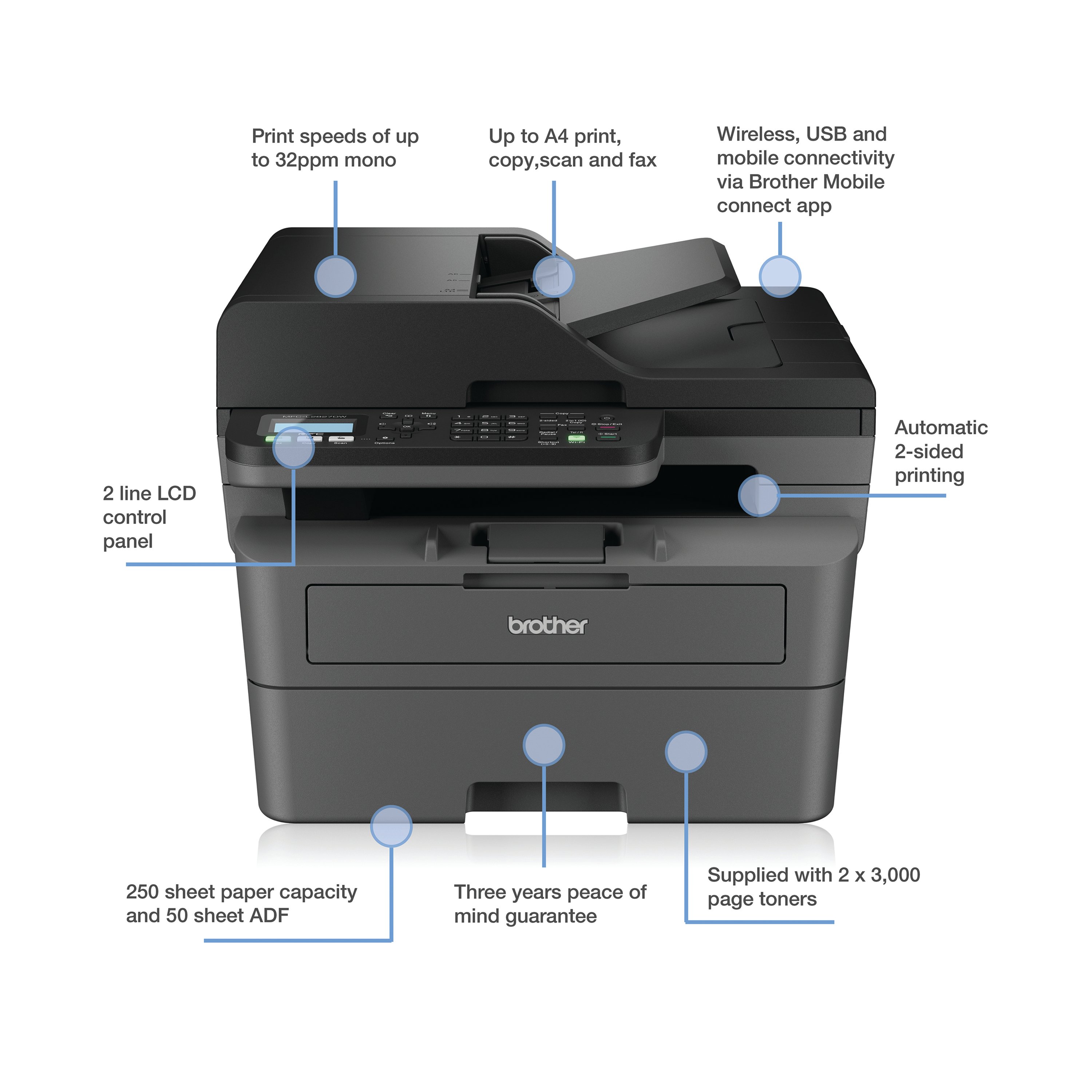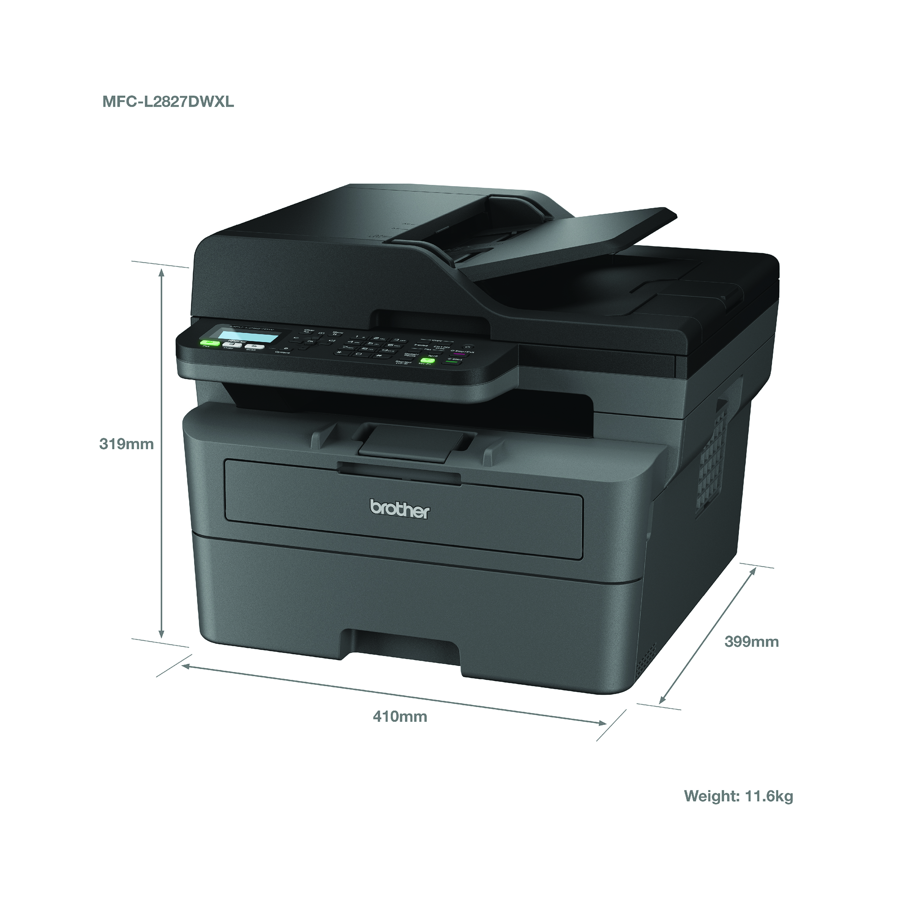 Work smarter from anywhere at home or in the office with the easily connected Brother MFC-L2827DWXL mono A4 all-in-1 laser printer. Supplied the all in box print bundle: 6,000 toner prints (2 x 3,000 page yield toner cartridges) and a 3-year peace of mind guarantee. With a 128MB internal memory. Secure by design, it uses triple-layer security at a device, network and document level, for peace of mind and guarantees that the integrity of your data is maintained. Hosting a range of efficiency-boosting features, this 3-in-1 mono laser printer saves you time with fast flawless printing and quick scan speeds, automatic 2-sided print. 1-sided printing and copying of up to 32 copies per minute, with a resolution of up to 1200 x 1200 dpi (printing) 600 x 600 dpi (copying). A generous 250 sheet paper tray capacity. The contact image sensor (CIS) scanner provides colour and mono scanning, 1200 x 1200 dpi. Fax modem with 33,600bps (Super G3), send the same fax message to up to 260 locations, a memory transmission of up to 400 pages. Connect with Hi-Speed USB 2.0, Wireless, Wi-Fi Direct. Mobile and Web connectivity: Brother Mobile Connect, Brother Print Service Plugin, Mopria (Android), Brother Mobile Connect (iPad/iphone), Apple AirPrint. A quiet mode to reduce the printing noise. All controlled via a 2 line LCD with keys control panel.