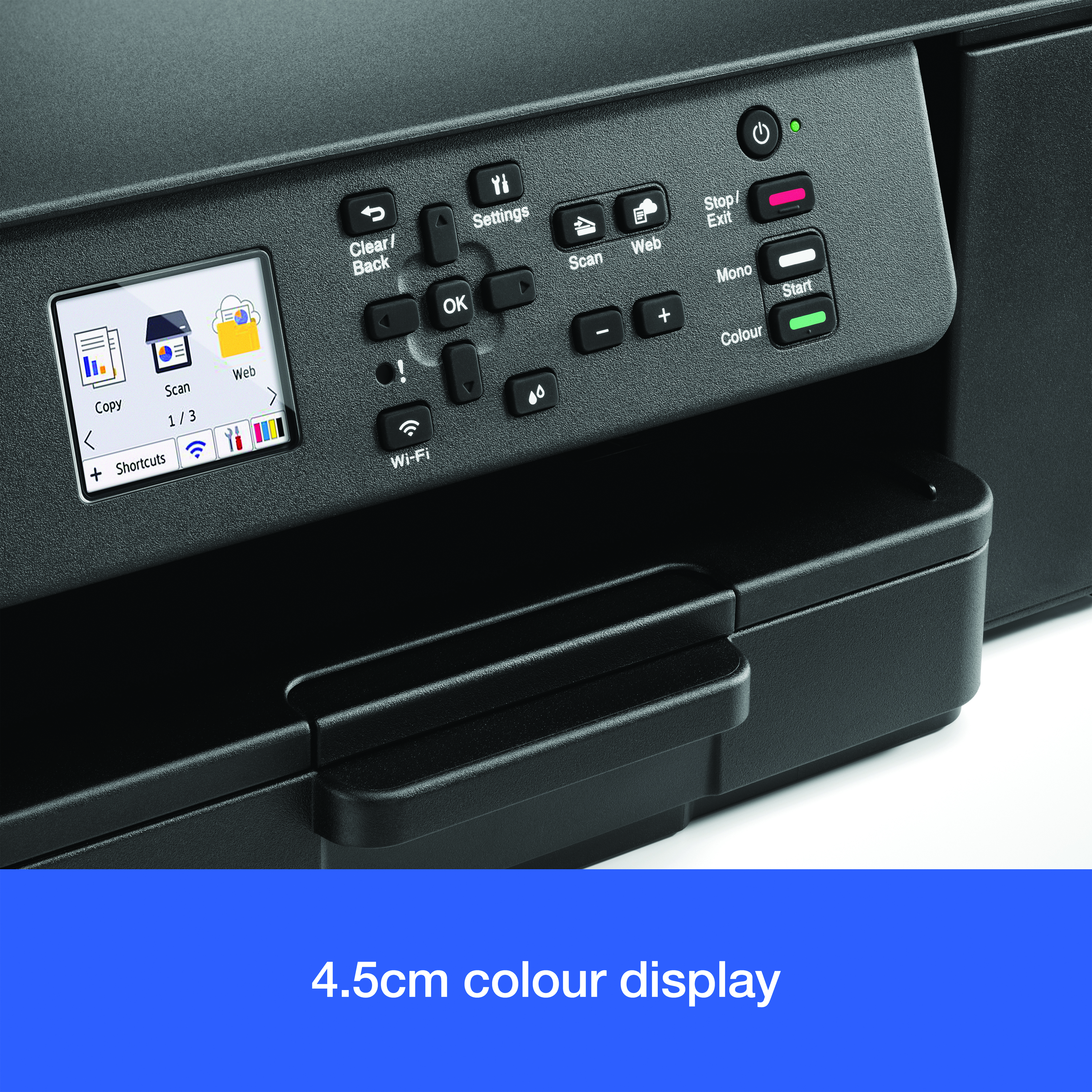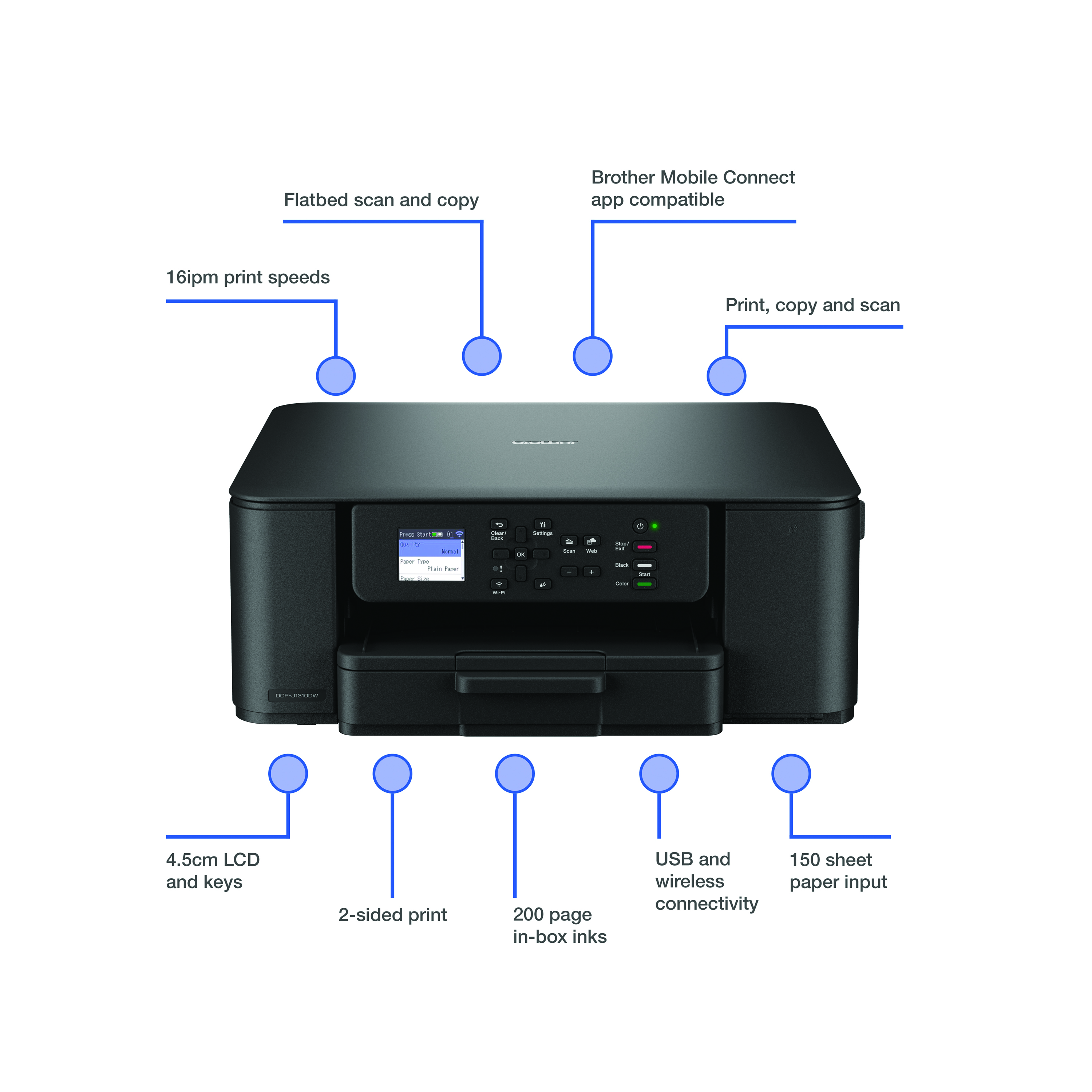 With its compact design and versatile functionality, the DCP-J1310DW makes printing effortless. Easily print, scan and copy from one device and navigate using the built-in colour display. Wireless connectivity allows everyone in your household to print easily from their laptop or mobile device.