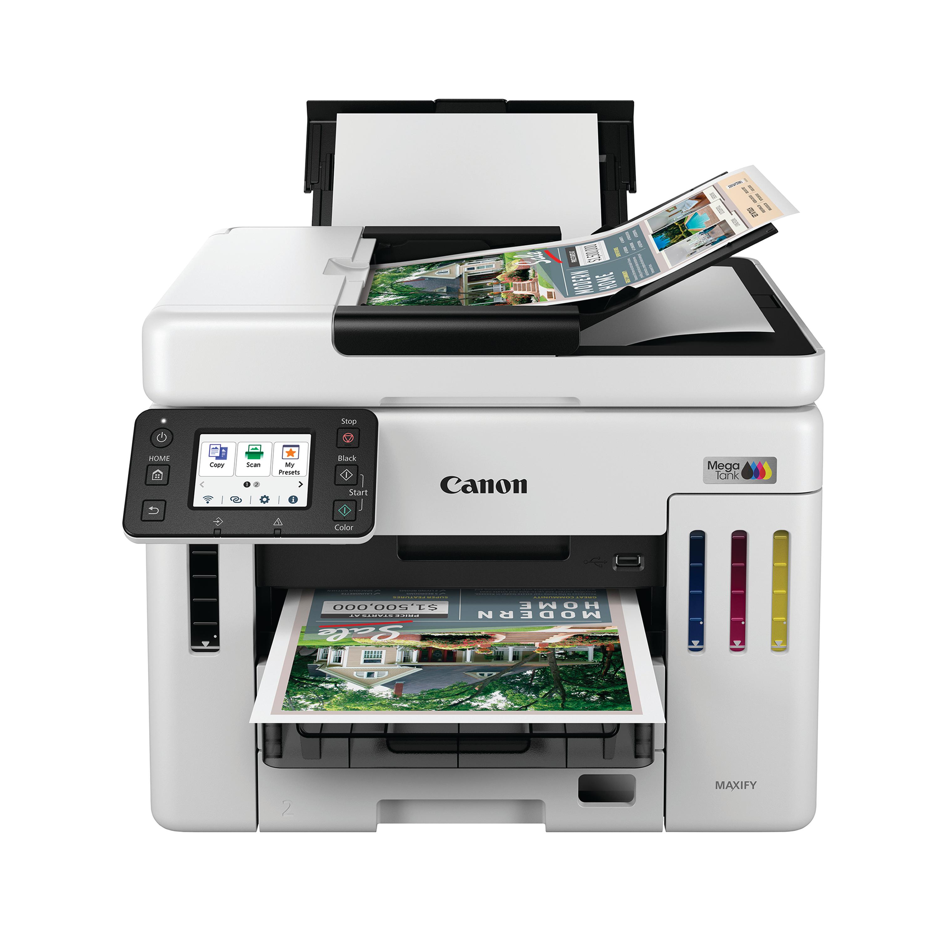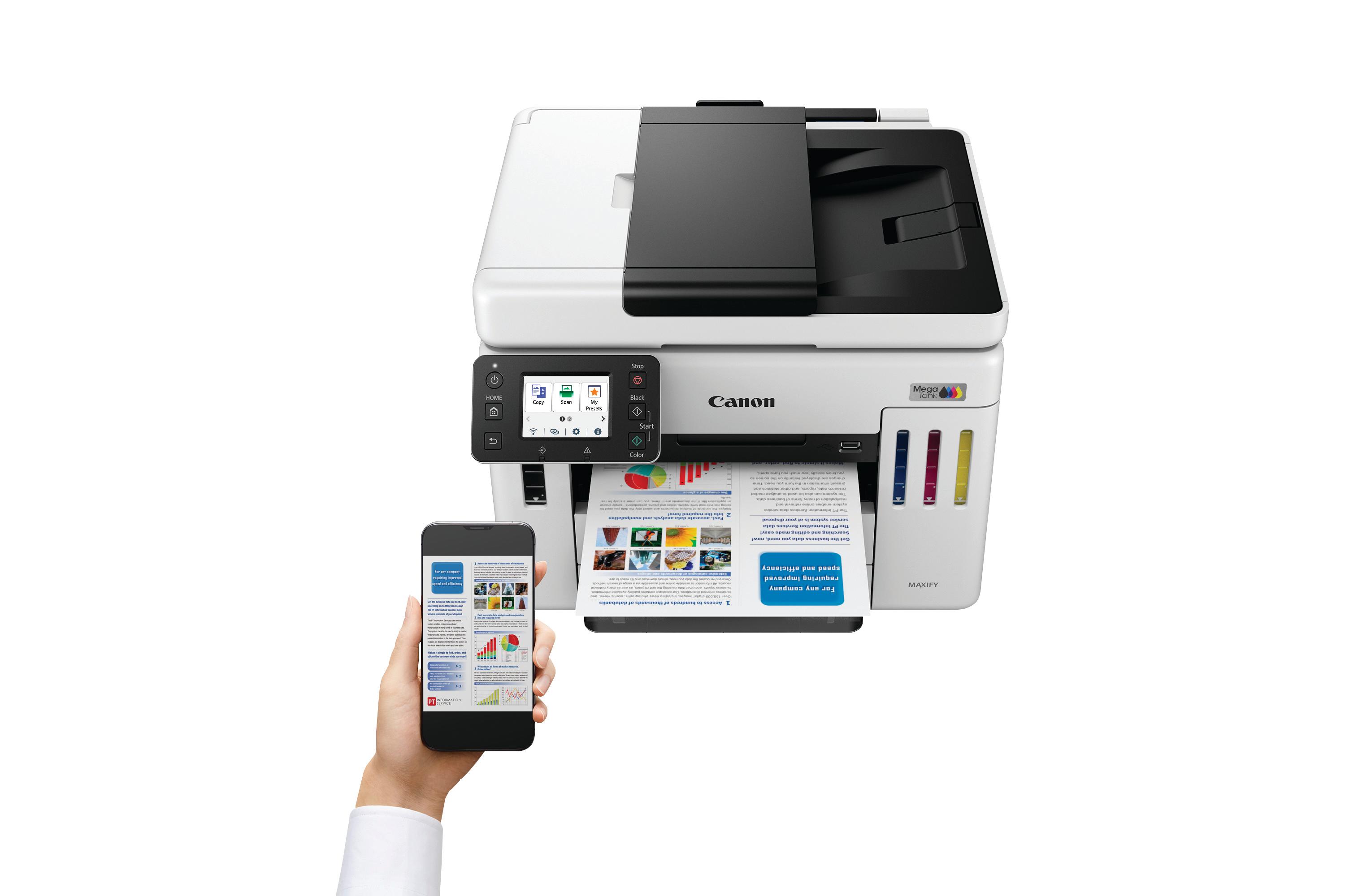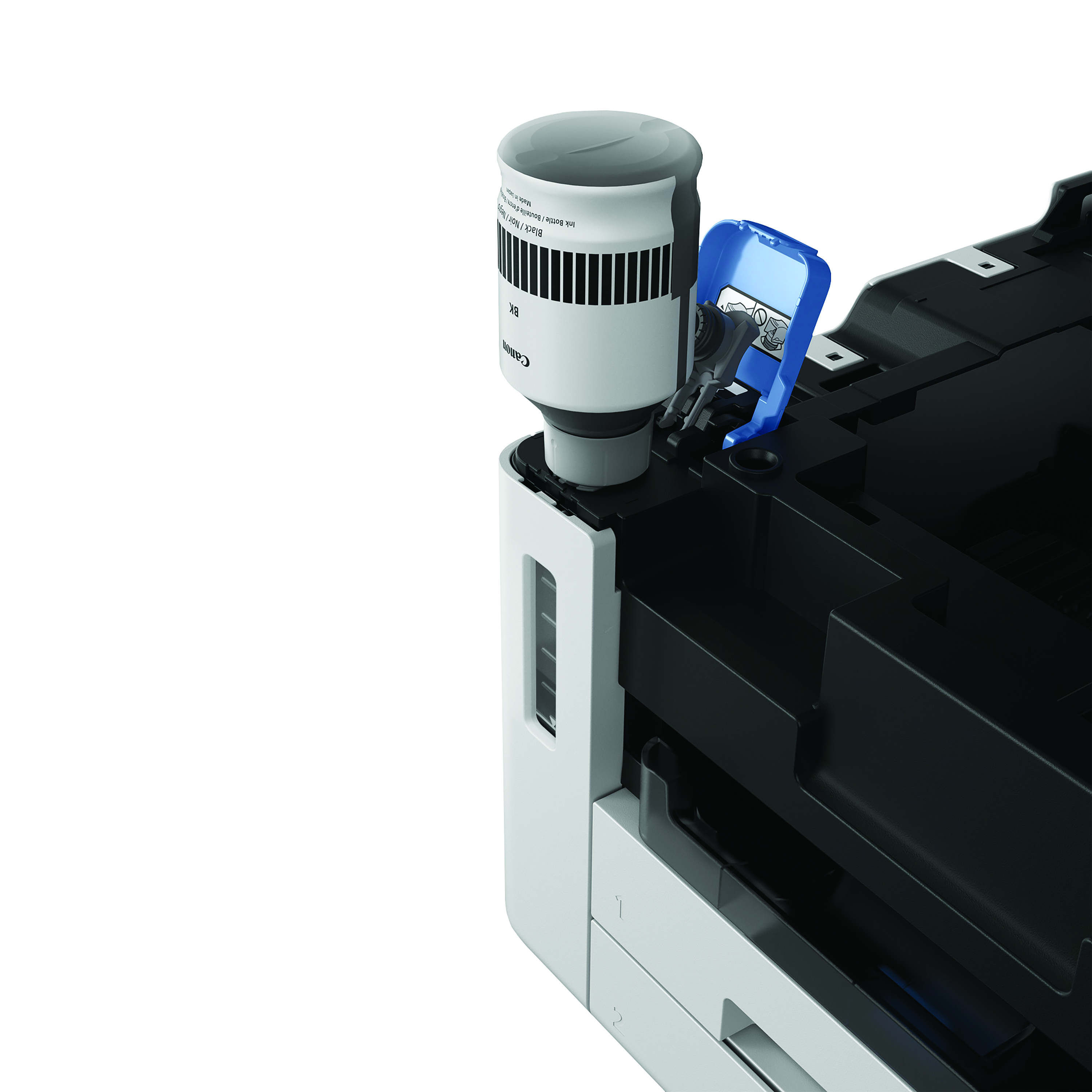 Save on total printing costs with the small-office workhorse Canon MAXIFY GX7150 All-in-One Refillable MegaTank Inkjet Printer. With a 14,000 page yield from a set of colour ink bottles or up to 6,000 page yield from a black ink bottle, you are guaranteed to keep business costs low during high-volume everyday printing. Small in size but packed in features, the printer includes a large 600-sheet paper capacity, 50-sheet D-ADF and print speeds of up to 24 ipm. Print, scan, copy and connect to Cloud, handle diverse media and enjoy multi-level security, all using the user-friendly 6.9cm tiltable LCD colour touchscreen. The printer will fit into your businesses workflow, and you can connect to the Canon PRINT App, Apple AirPrint (iOS) and Mopria (Android) to enable round-the-clock 24-hour printing from any location.