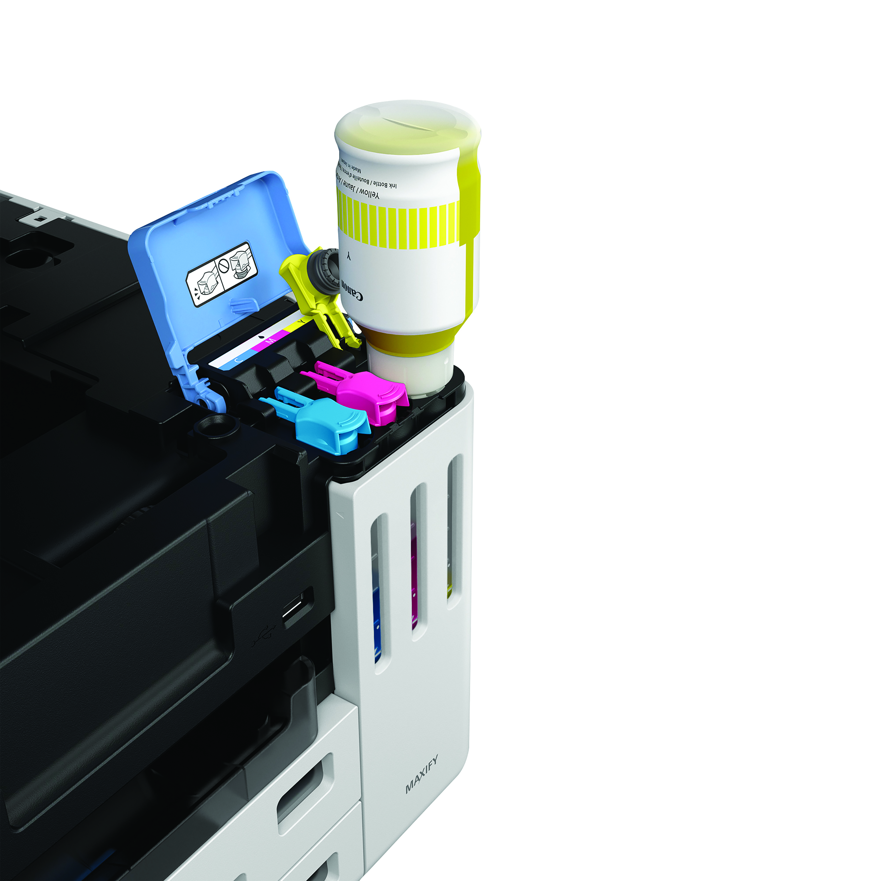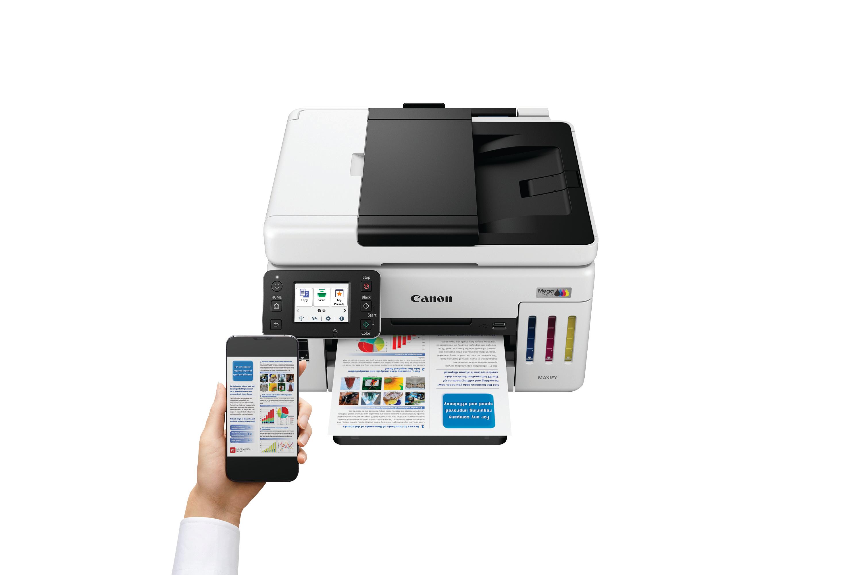 Save on total printing costs with the small-office workhorse Canon MAXIFY GX6150 3-in-1 Refillable MegaTank Inkjet Printer. With a 14,000 page yield from a set of colour ink bottles or up to 6,000 page yield from a black ink bottle, you are guaranteed to keep business costs low during high-volume everyday printing. Small in size but packed in features, the printer includes 350-sheet paper capacity, 50-sheet ADF and print speeds of up to 24 ipm. Print, scan, copy and connect to Cloud, handle diverse media and enjoy multi-level security, all using the user-friendly 6.9cm tiltable LCD colour touchscreen. The printer will fit into your businesses workflow, and you can connect to the Canon PRINT App, Apple AirPrint (iOS) and Mopria (Android) to enable round-the-clock 24-hour printing from any location.