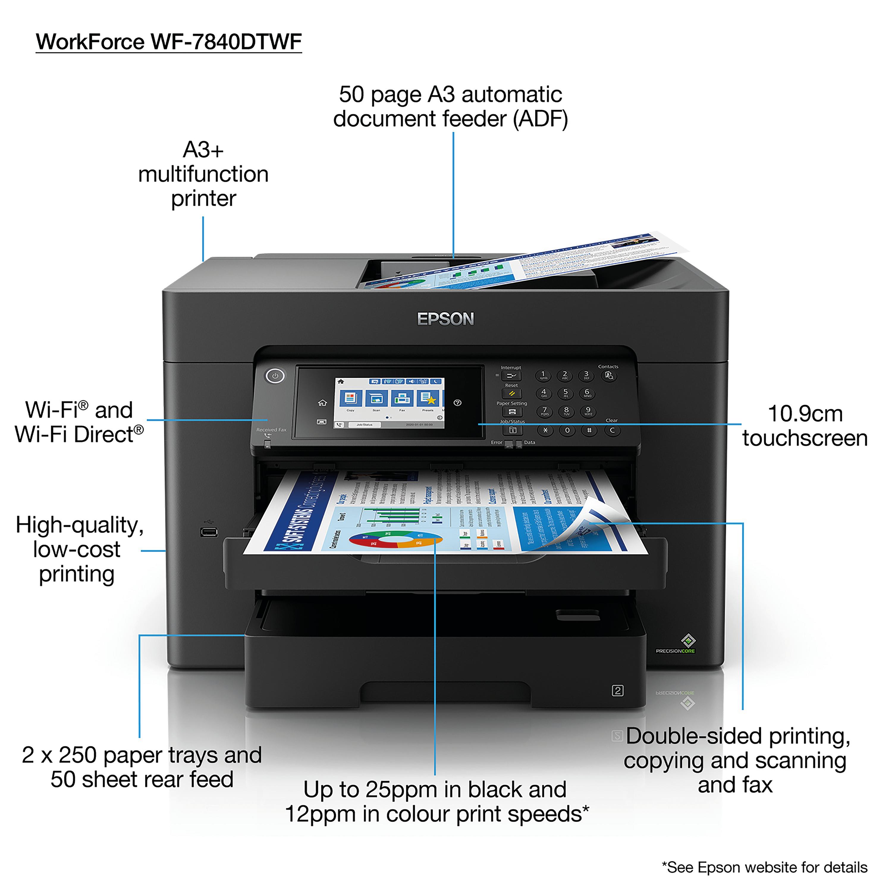 Think big with this high-quality multifunction with double-sided printing, copying and scanning all up to A3. You'll stride through tasks with print speeds of up to 25ppm in black and a 50 page A3 automatic document feeder. And that's not forgetting its cost-effective inks and flexible wireless connectivity solutions such as and Scan-to-cloud.