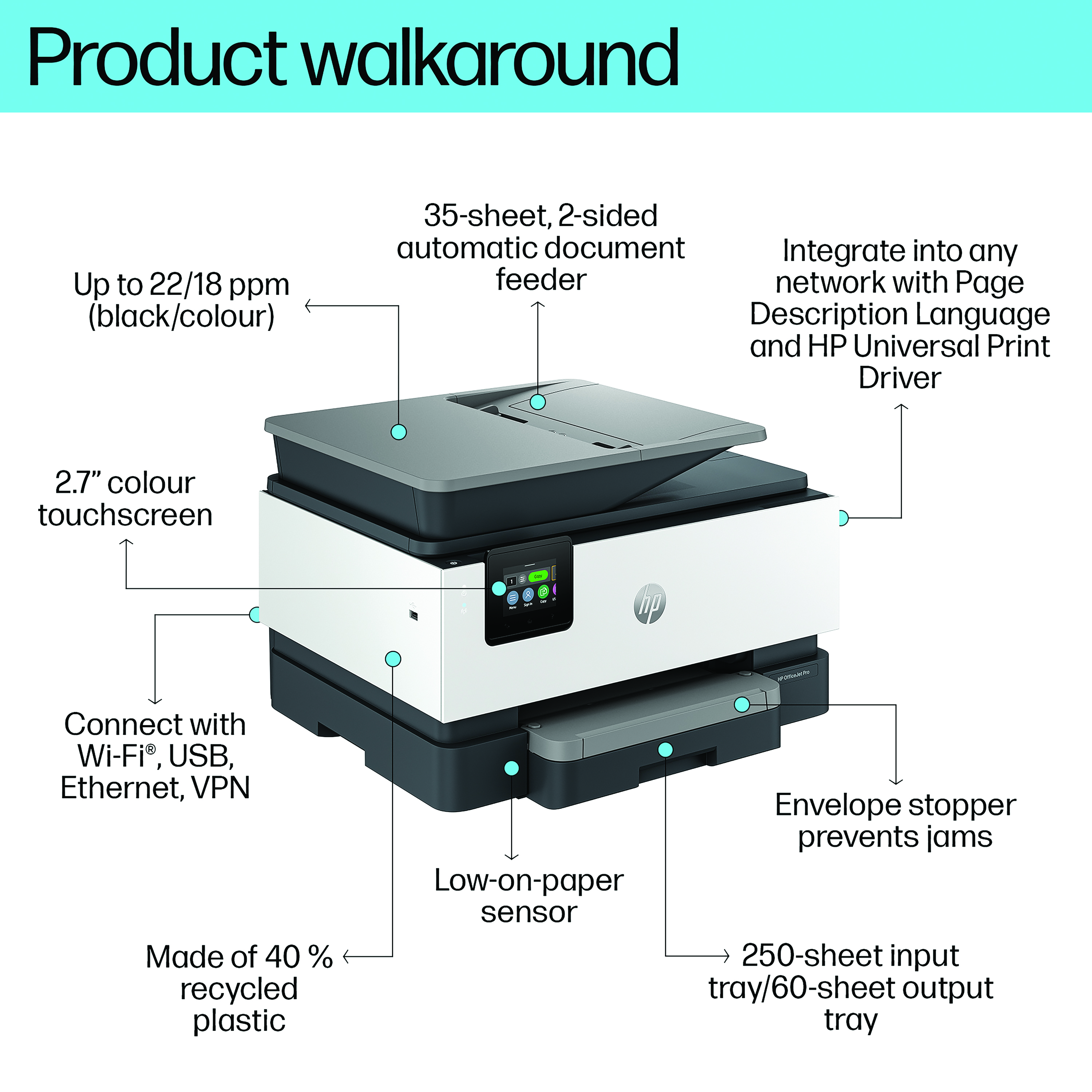 The professional colour inkjet printer for distributed offices and hybrid workforce from HP. Always ready for high volumes, this HP OfficeJet Pro printer comes equipped with a 250-page input tray. Avoid waiting by the printer with an automatic document feeder enabling double-sided scanning. This printer is intended to work only with cartridges that have a new or reused HP chip, and it uses dynamic security measures to block cartridges using a non-HP chip. Periodic firmware updates will maintain the effectiveness of these measures and block cartridges that previously worked. A reused HP chip enables the use of reused, remanufactured, and refilled cartridges.