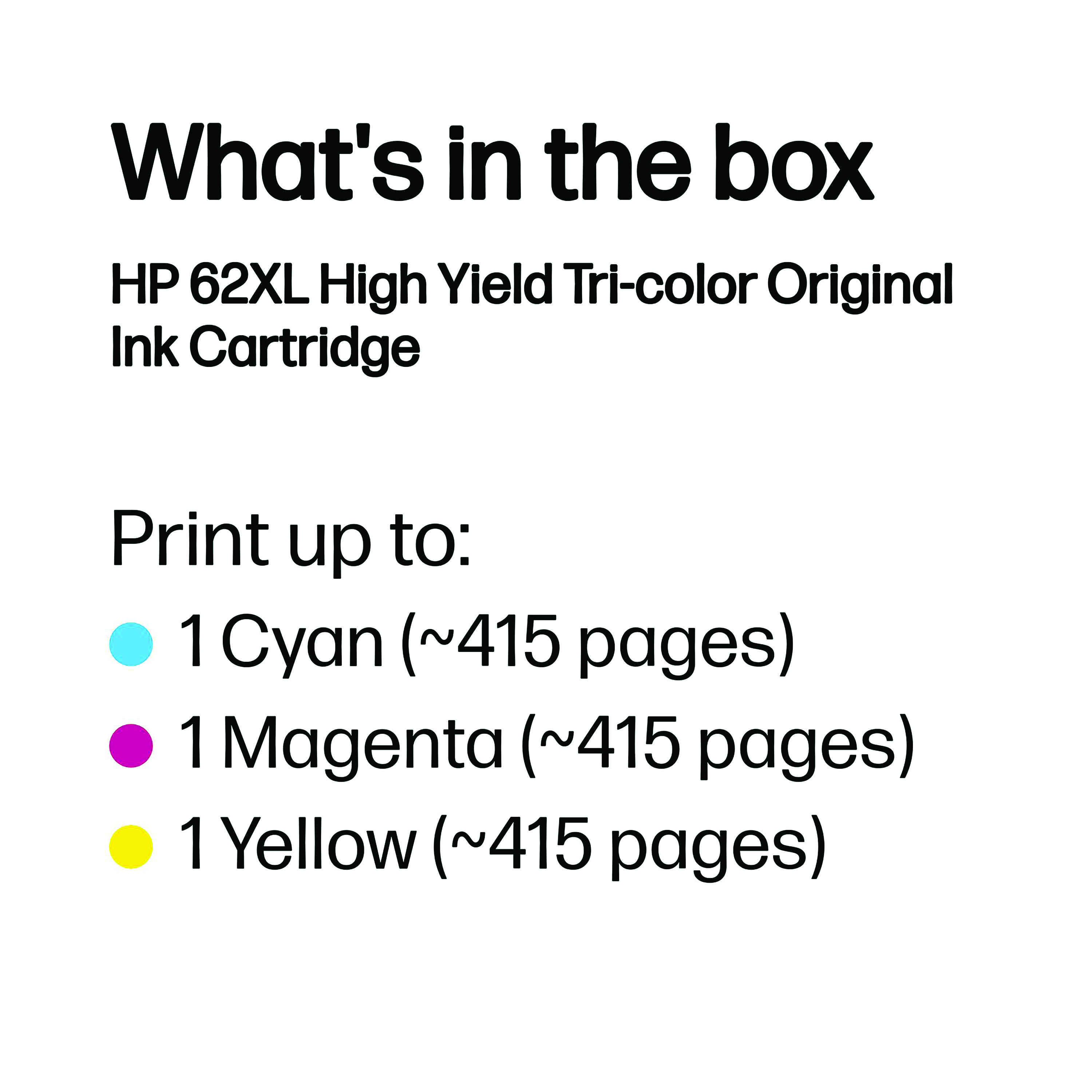 For reliable performance and consistent, outstanding results, choose HP original ink cartridges. Designed and tested for optimal results, these HP 62XL cartridges are supplied as a complete print head and ink unit and are designed to prevent clogging and corrosion. Producing vivid colour documents and lab-quality photos that dry quickly, the HP 62 XL Tri-color cartridge also has an impressive page yield of 415 pages.