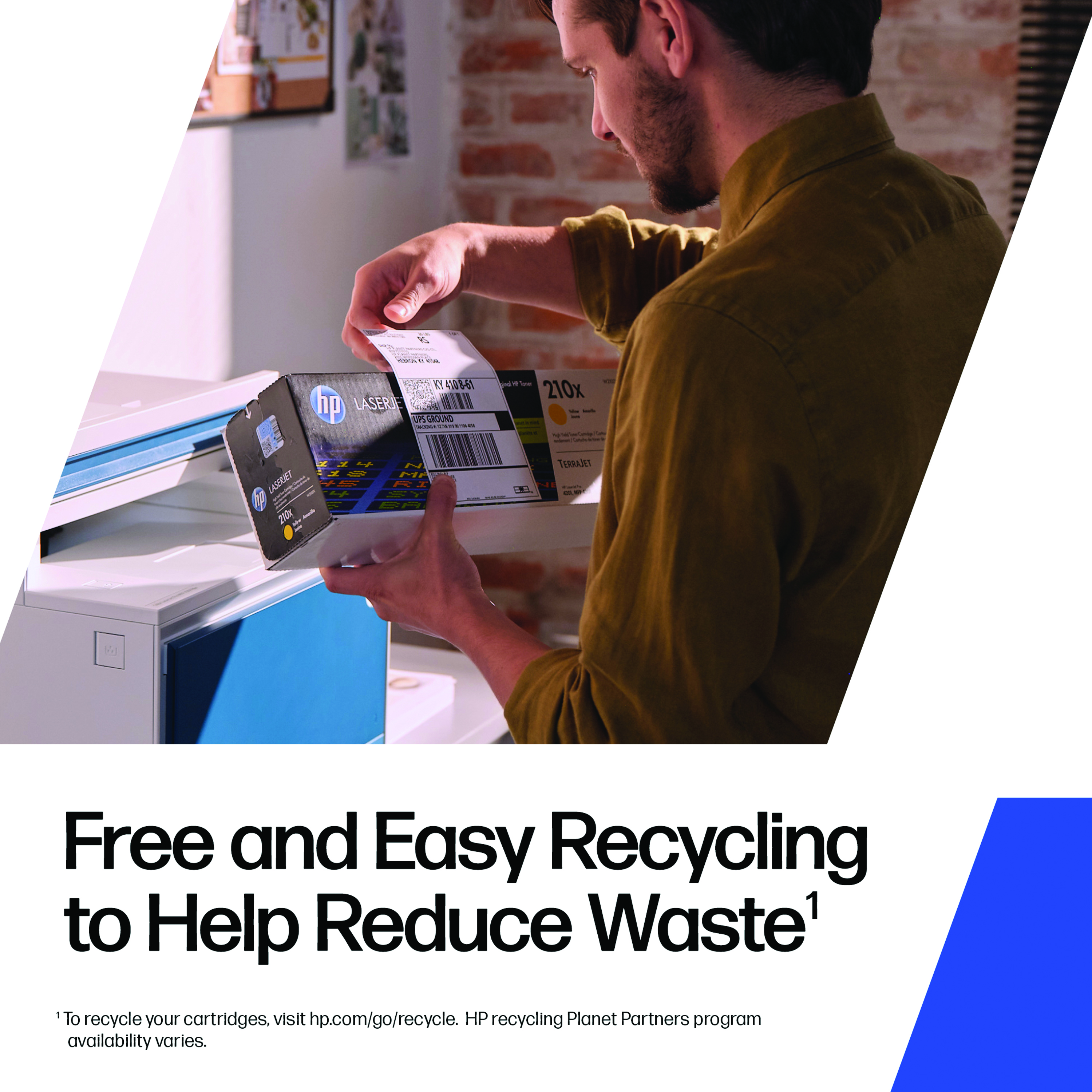 Materials from recycled HP cartridges are used to manufacture new Original HP cartridges and help reduce plastic waste