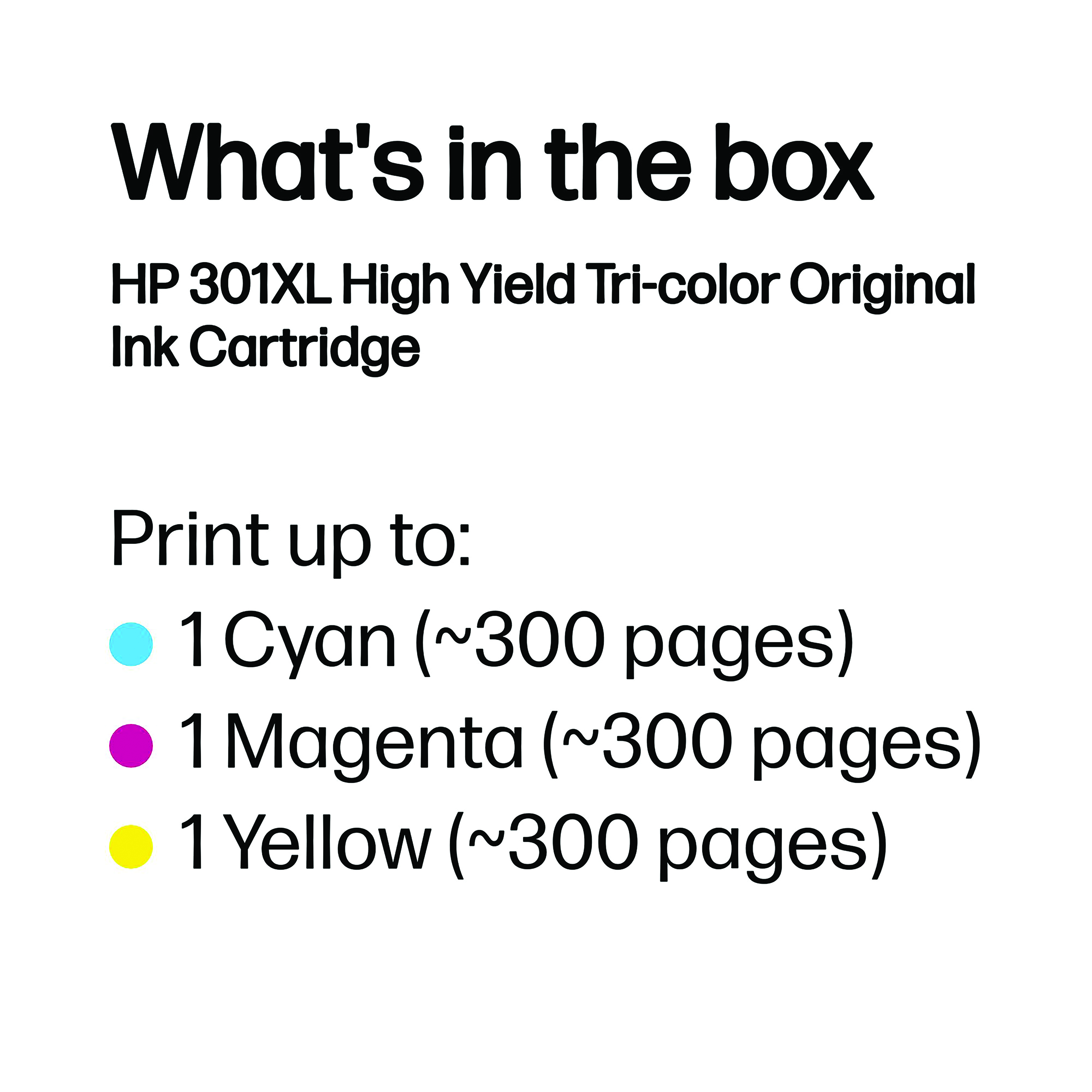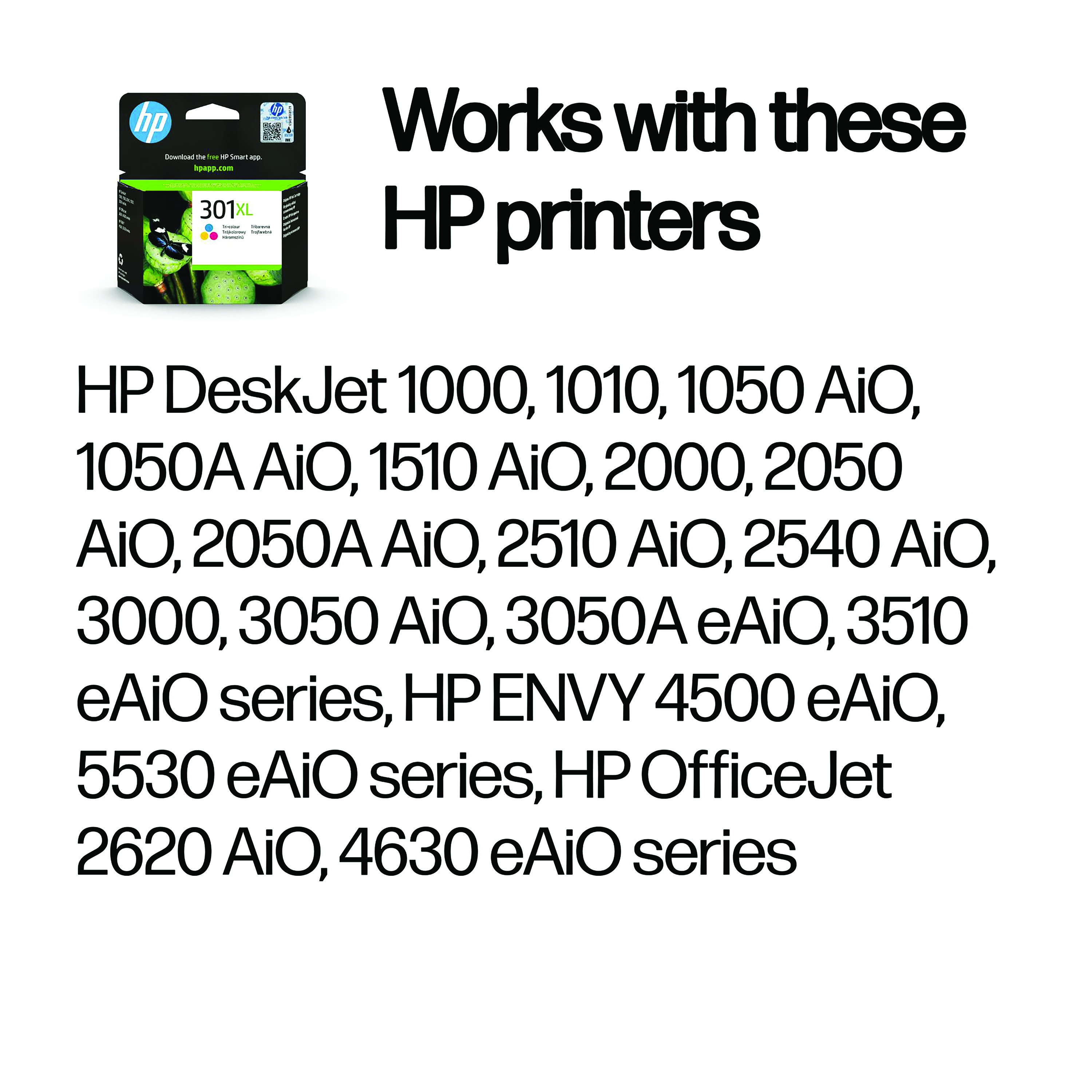 Giving you the highest level of precision, the HP 301XL Tri-Colour Inkjet Cartridge produces high quality prints. For use with HP DeskJet 1000, 1010, 1050, 1510, 2050, 2510, 2512, 2540, 3000, 3050, 3055, HP Envy 4500, 5530 and HP OfficeJet 2620, 4630 printers. Each cartridge has a print yield of up to 300 pages. This pack contains a tri-colour cartridge of cyan, magenta and yellow ink.